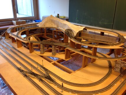 Peter Bähler aus Heimenschwand hat uns diese tolle Anlage kostenlos überlassen. Nun bauen wir im Werken das Gelände aus. Mit Gipsbandagen und Gitter formen wir die Landschaft. Natürlich dürfen Testfahrten mit Lok und Wagen als Motivation nicht fehlen.